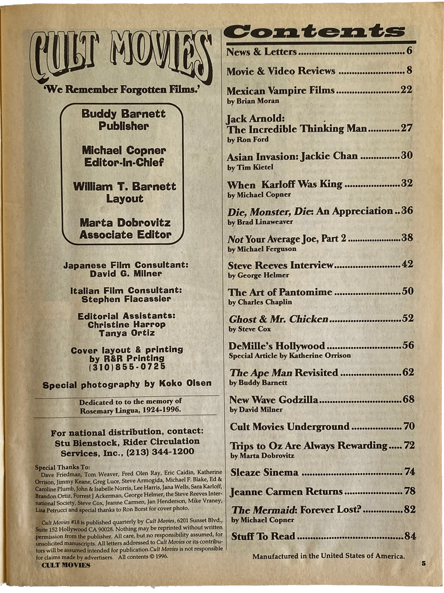 Cult Movies #18 featuring interview with Superman's Steve Reeves, Boris Karloff, Bela Lugosi, Joe Dallesandro and more! Each issue is bagged for protection.