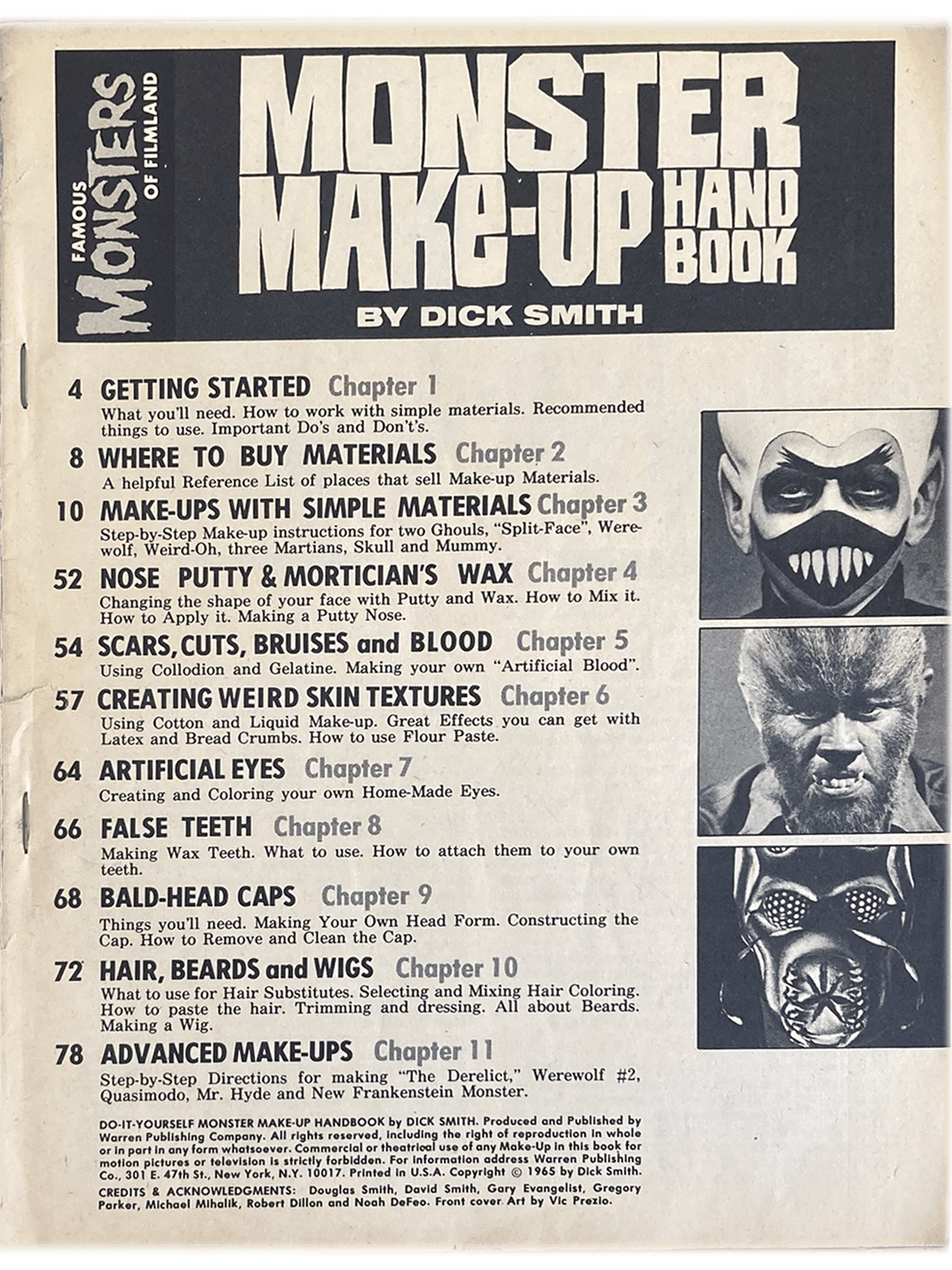 In 1965 Forrest Ackerman, horror super-fan and publisher of Famous Monsters of Filmland, commissioned legendary makeup artist Dick Smith to create an illustrated make-up guide that the average reader of his magazine could follow along with using common household supplies.