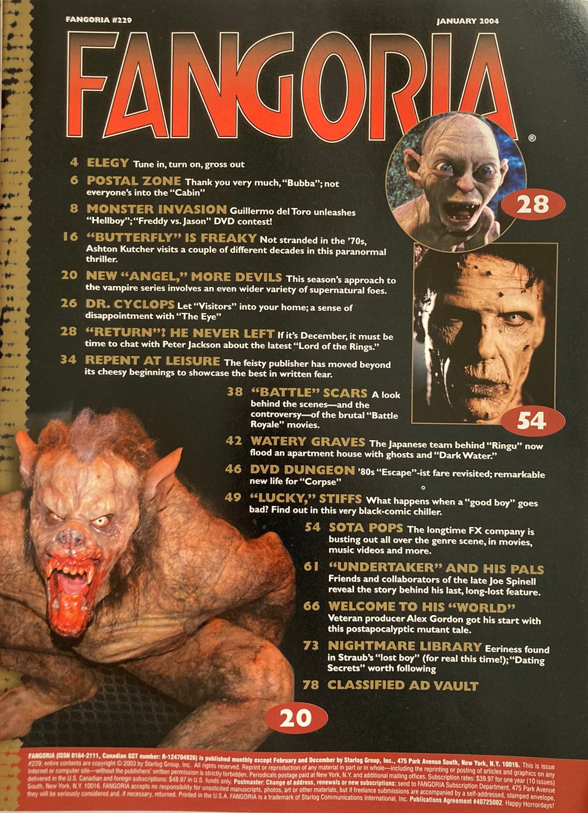 Fangoria Magazine #229 featuring Lord of the Rings, Angel, Battle Royale II, and more! In like-new condition. Will come bagged for protection.