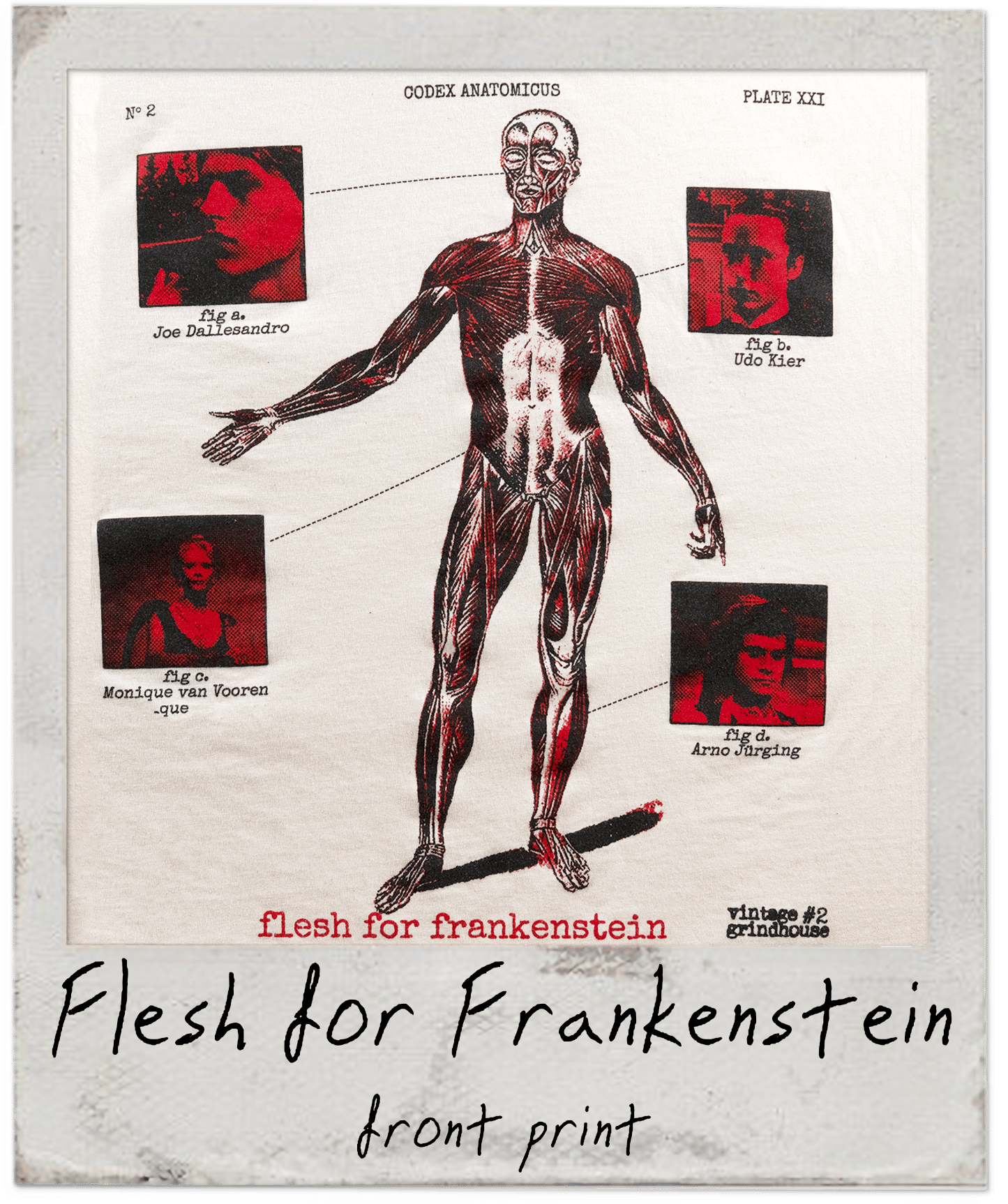 Udo Kier. Joe Dallesandro. Arno Jürging. All directed by Paul Morrissey under the auspices of Andy Warhol in 2 of the strangest takes on Dracula and Frankenstein. Presented to you here in shirt form!