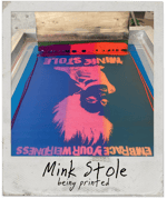 Printed in florescent pink, orange, and purple in a "split-fountain" technique which results in a slightly different look each time as the colors slowly blend. The pictured shirt is a representative sample.