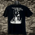 This is hand printed by the designer on a Black 100% ringspun cotton shirt.